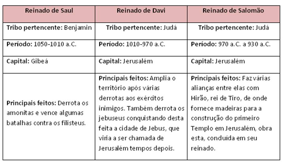 Após Samuel envelhecer e seus filhos não andarem nos mesmos caminhos que andara, os anciãos de todo Israel se reuniram com ele para pedirem um rei, assim como as outras nações vizinhas possuíam (I Sm 8). Através da vontade permissiva de Deus, Ele concede um rei para que governasse sobre seu povo, o nome deste primeiro rei seria Saul (I Sm 10). Depois dele sucederam Davi e Salomão. Cada um deles reinou quarenta anos sobre Israel.
